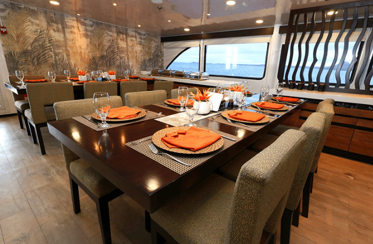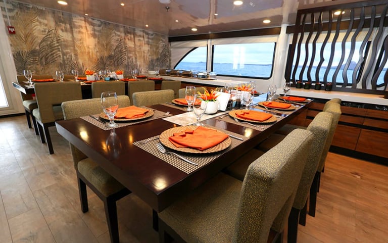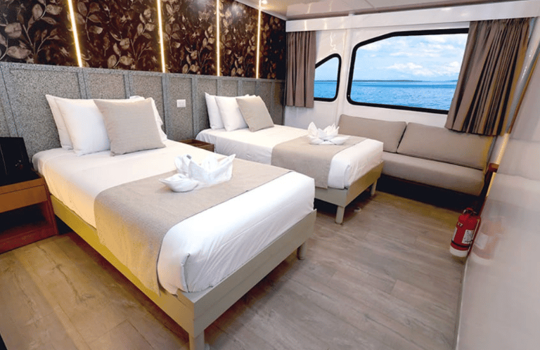 The twin-hull catamaran smooths inter-island hops, while the crew keeps days flowing, from sunrise briefings and blue-water snorkeling to golden-hour sunsets on the sun deck. It is small-ship comfort with an eco-conscience.