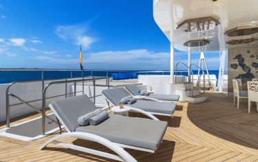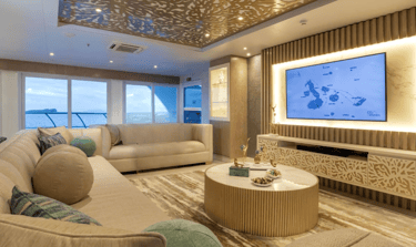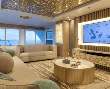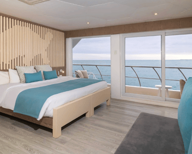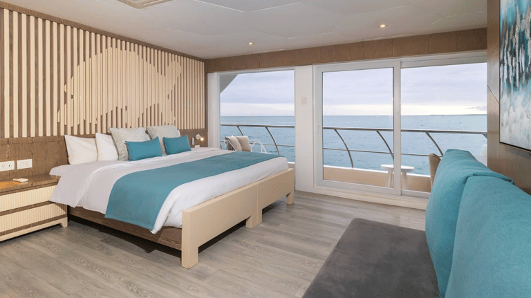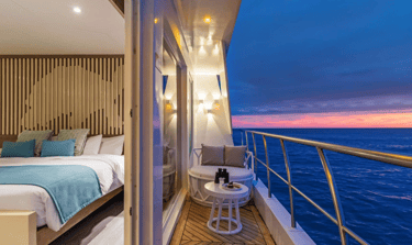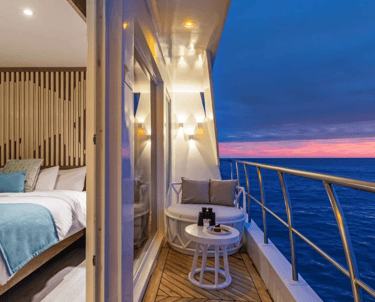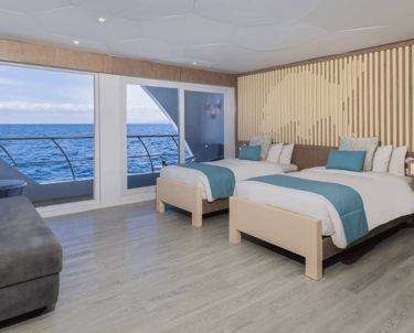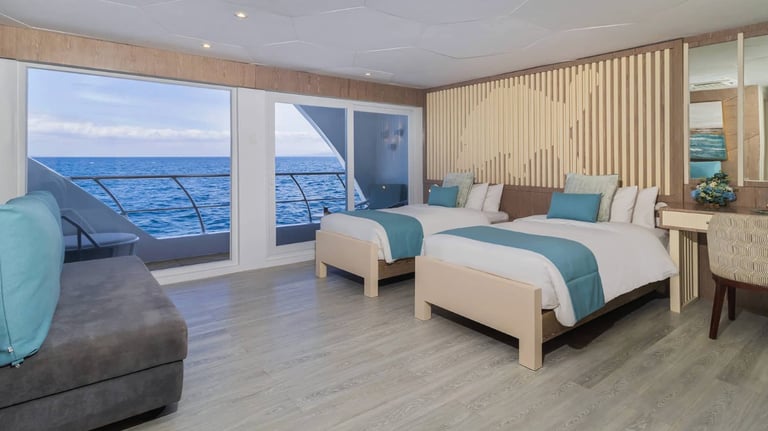 Suites with Panoramic Views: Bright, view-first cabins keep the islands front-and-center—wake to lava silhouettes, nap to the hush of the equator, and end the day with balcony star-watching.