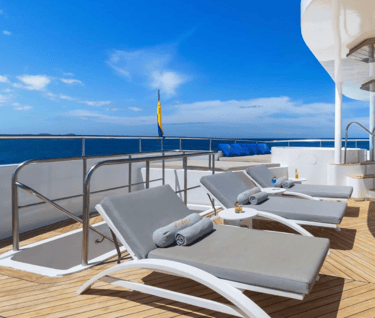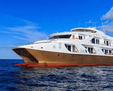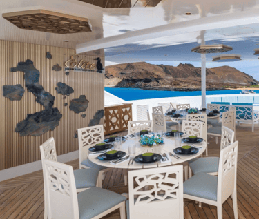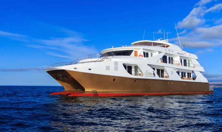 Elite is a purpose-built Galapagos luxury catamaran with an airy sky deck, panoramic-window suites, and a layout tuned for quick Zodiac access, so you spend more time with wildlife and less time waiting in lines.