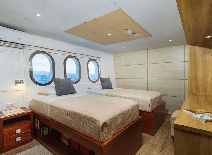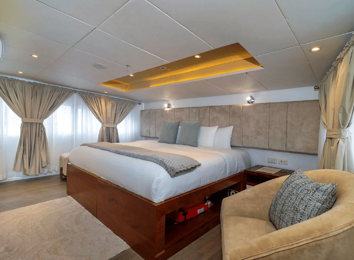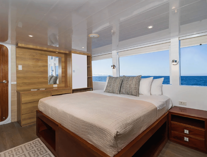 Gran Daphne feels like a modern field base at sea, quiet, nimble, and intentionally guest-centric. Ashore, small groups and story-driven guiding place you eye-level with the archipelago’s rhythms: iguanas soaking warmth from black basalt, sea lions threading green bays, seabirds riding invisible windlines. Back on board, the atmosphere stays calm and contemporary, rinse off the salt, review sightings with your guide, and watch the Pacific shift from cobalt to constellations. If you value stylish simplicity, naturalist-led exploration, and low-crowd wildlife encounters, Gran Daphne fits beautifully.