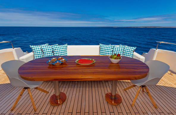 Spaces that breathe: A bright lounge for briefings and nightcaps, shaded seating for reading, and open foredecks designed for stable, long looks at the sea.