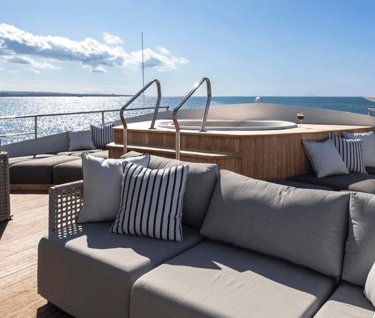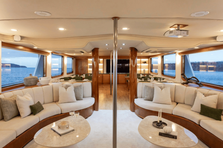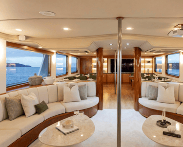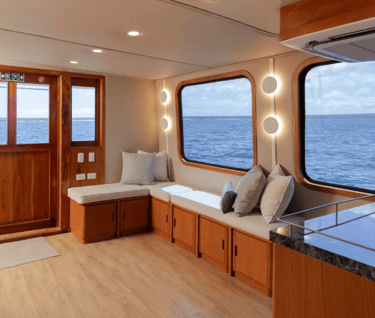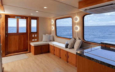 Refined onboard life: Chef-prepared meals, welcoming lounge & bar, sunny deck for stargazing.