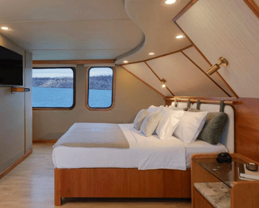 With capacity for 16 guests, the yacht offers staterooms with twin/queen/king bedding options ensuite bathrooms, individual climate control, mini-fridge, and in-room safe. A dedicated option for solo travelers who prefer privacy without paying a full double option is also available.