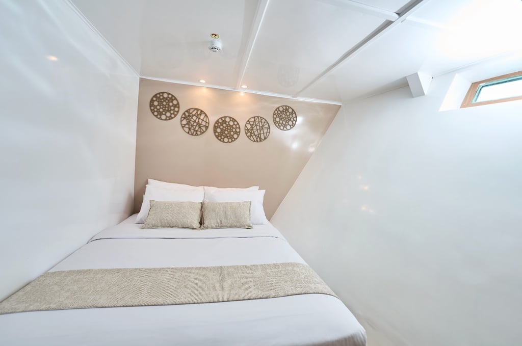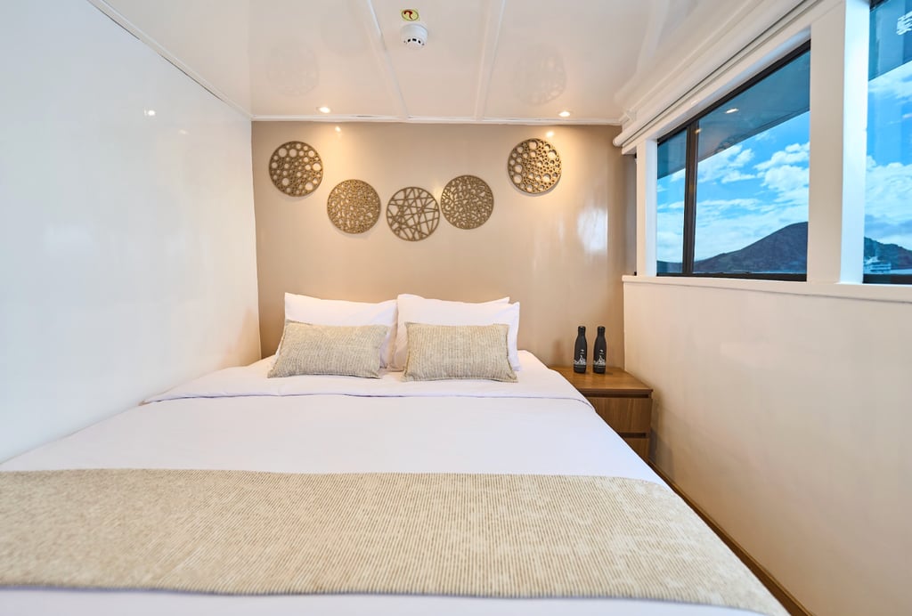 6 Upper Double Bed / Twin Cabins with large windows overlooking the ocean + 2 Lower Deck Double Bed Cabins with Portholes and 2 Lower Deck Twin Bed Cabins with Portholes.