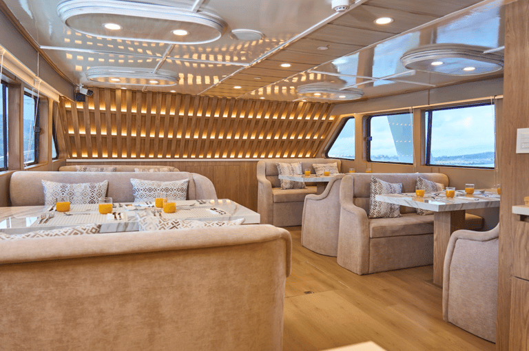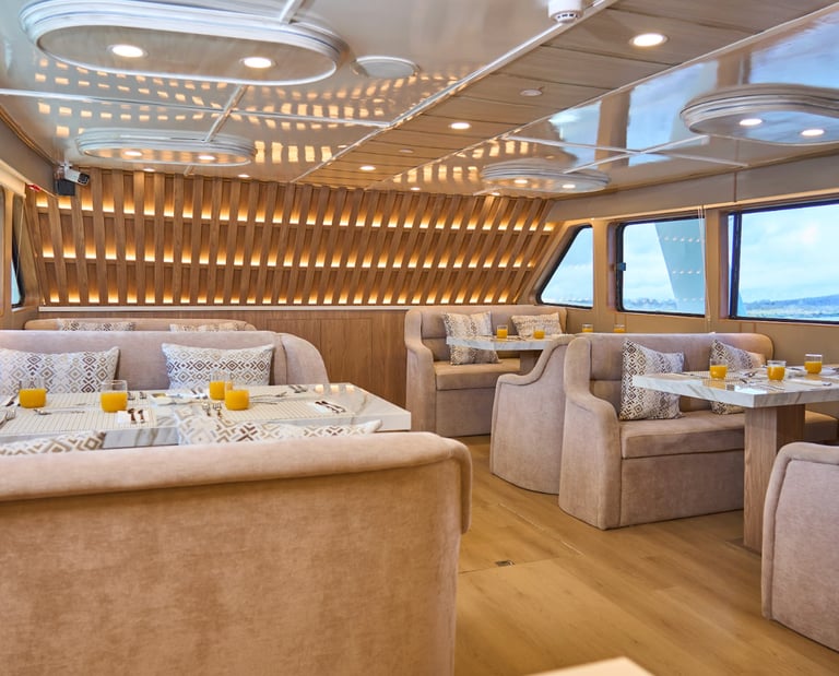 Gather & Unwind: Lounge for briefings and nightcaps, shaded seating for midday reading, and open bow/upper decks for long, uninterrupted sightlines.