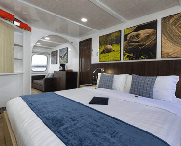 In the afternoons prepare yourself to enjoy unique snorkeling above reefs and lava shelves, kayaking calm coves (on many departures), or scenic Zodiac exploration and by evenings take advantage of the special Galapagos golden-hour on deck, relaxed talks in the lounge, and unfiltered stars. Power outlets are standard; connectivity is limited—ideal for a gentle digital detox.