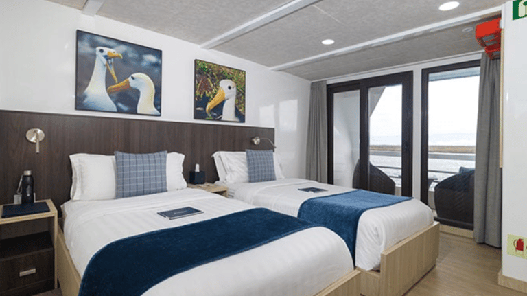 Ocean-view living: Bright, outside cabins with private bath and climate control for restful nights between adventures.