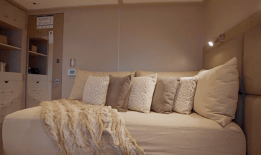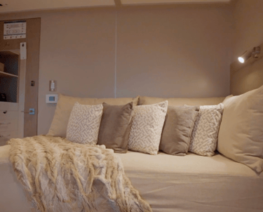 Bedroom Comforts: Pillow menu + memory-foam mattress, sectional closet with drawers, reading lights & blackout curtains.
