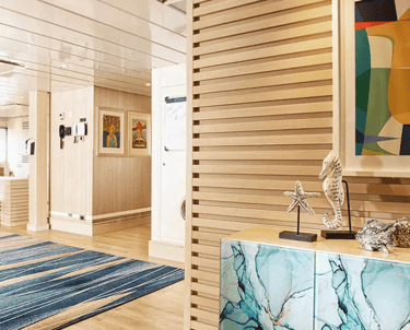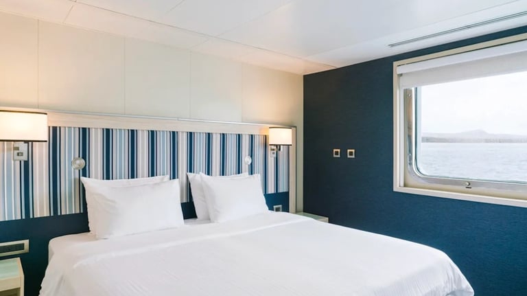 Between outings, unwind in bright social areas, grab a coffee in the observation lounge, or step out on deck to watch frigatebirds ride the breeze. Dining leans fresh and local, service is polished yet friendly, and the daily rhythm feels exactly right for a Galapagos expedition cruise: immersive by day, relaxed by night.