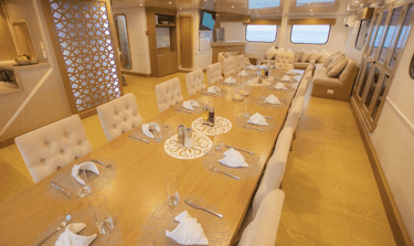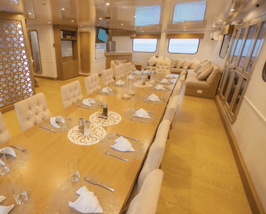 Hosting 16 guests in 8 cabins: 2 Upper-Deck Suites and 6 Main-Deck Cabins, the intimate footprint keeps lounges, sun deck, and boarding points close and convenient.