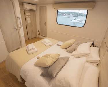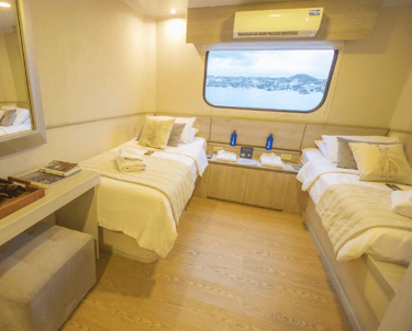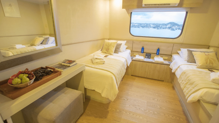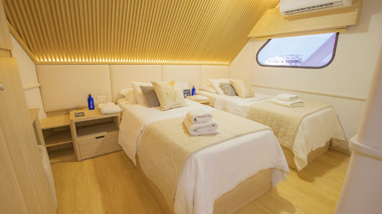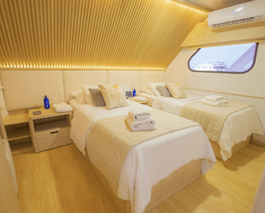 Six main-deck cabins with twin beds (some convertible) and two upper-deck suites with a matrimonial bed. All include private bath, A/C, and ocean-view windows.
