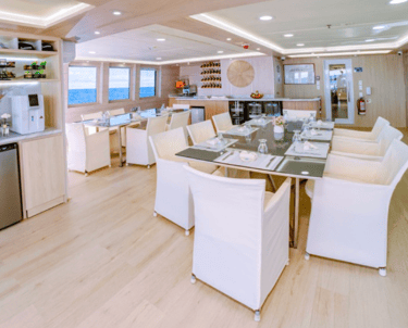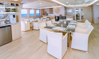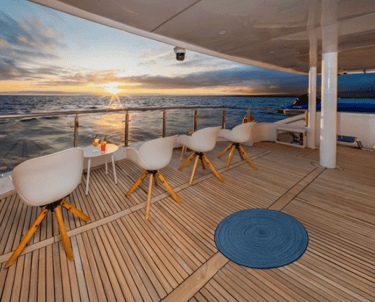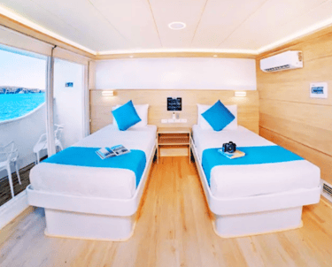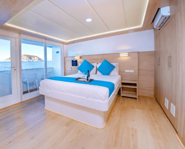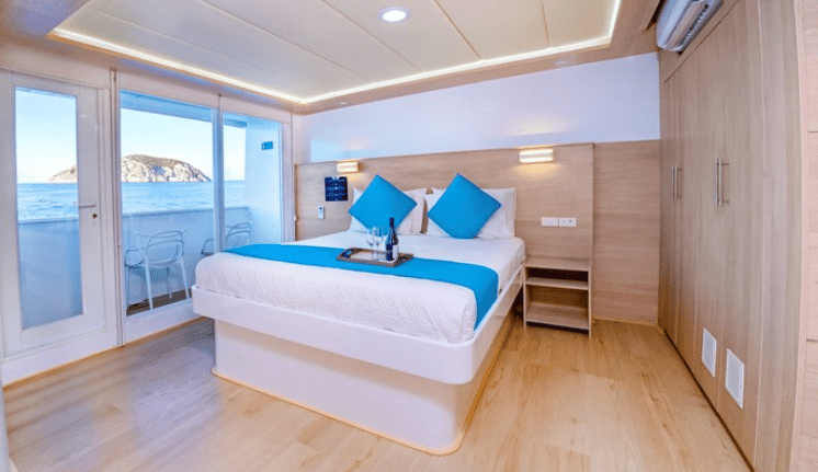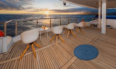 Every cabin features a private balcony, air-conditioning, and panoramic windows—perfect for sunrise seabirds or a quiet nightcap under the equatorial sky. Daily outings with a Galapagos National Park–certified naturalist bring you face-to-face with blue-footed boobies, marine iguanas, sea turtles, and, if you are lucky, Galápagos penguins. Between adventures, the jacuzzi sun deck and shaded terrace set the tone for golden-hour decompressing.