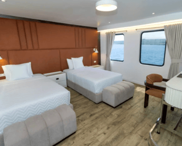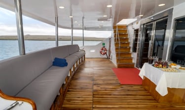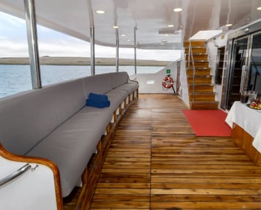 Queen Beatriz is a boutique Galapagos yacht built for travelers who notice the little things, the shine on black-lava shores, the quiet arc of a pelican, the way afternoon light brushes a cliff. Her personality is equal parts style and substance: ocean-view staterooms designed for real rest, generous open decks for front-row wildlife watching, and welcoming lounges where briefings feel like conversations, not lectures. The layout is intentionally compact, short steps from cabin to gear station to Zodiac boarding, so your energy stays focused on discovery.