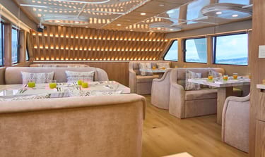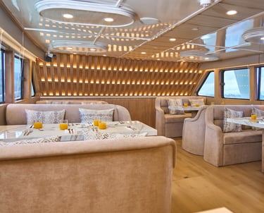 Gather & Unwind: Lounge for briefings and nightcaps, shaded seating for midday reading, and open bow/upper decks for long, uninterrupted sightlines.