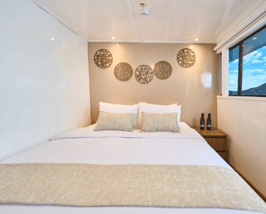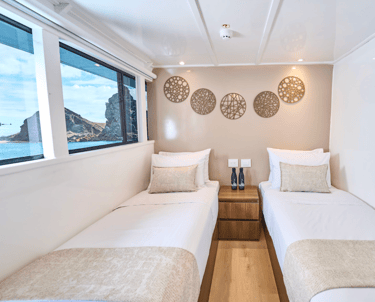 6 Upper Double Bed / Twin Cabins with large windows overlooking the ocean + 2 Lower Deck Double Bed Cabins with Portholes and 2 Lower Deck Twin Bed Cabins with Portholes.